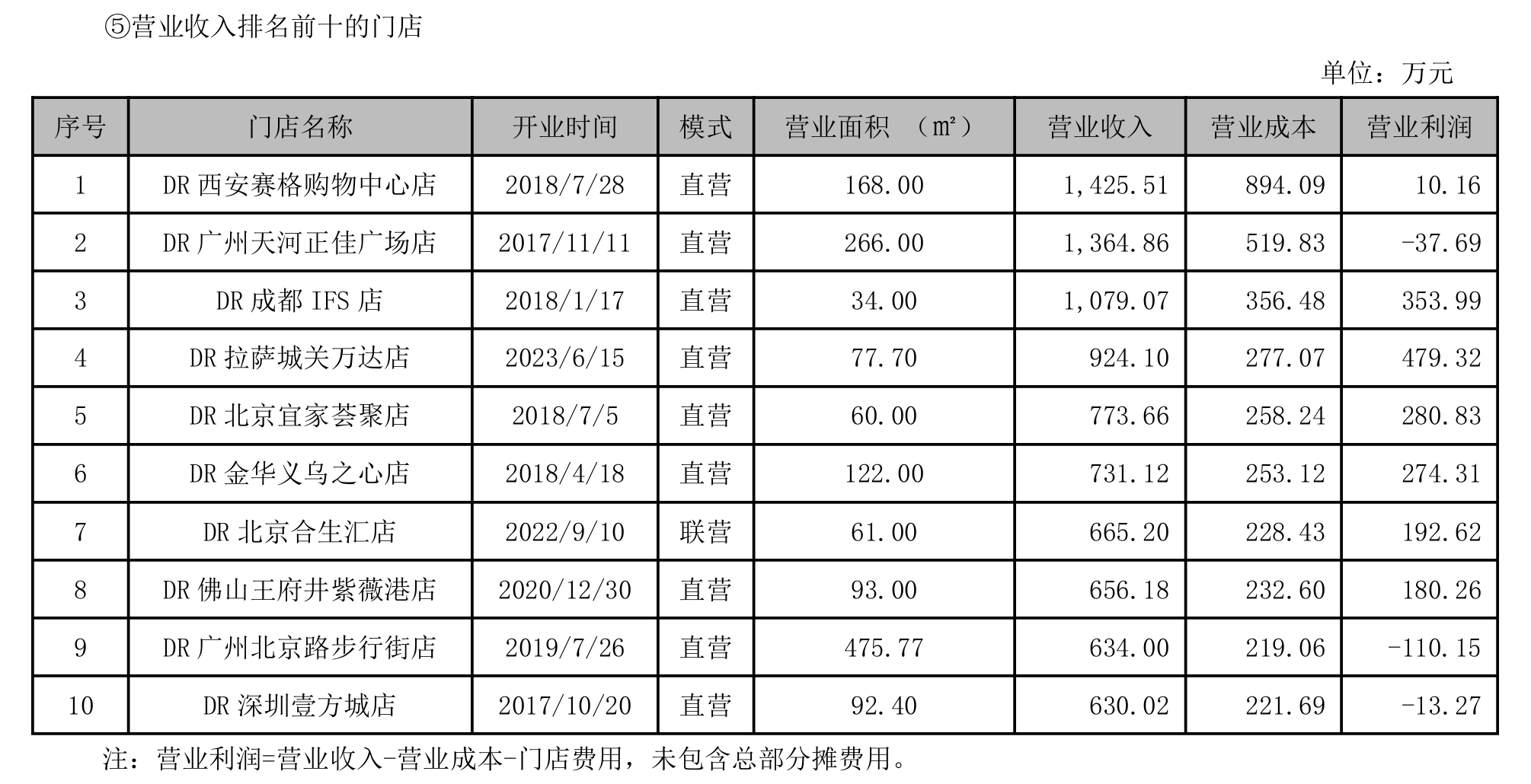 深圳商报·读创客户端记者注意到,该公司营收排名前十的门店中,“销冠”门店DR西安赛格购物中心店营业利润仅10.16万元,DR广州天河正佳广场店、广州北京路步行街店、深圳壹方城店分别亏损37.69万元、110.15万元、13.27万元。